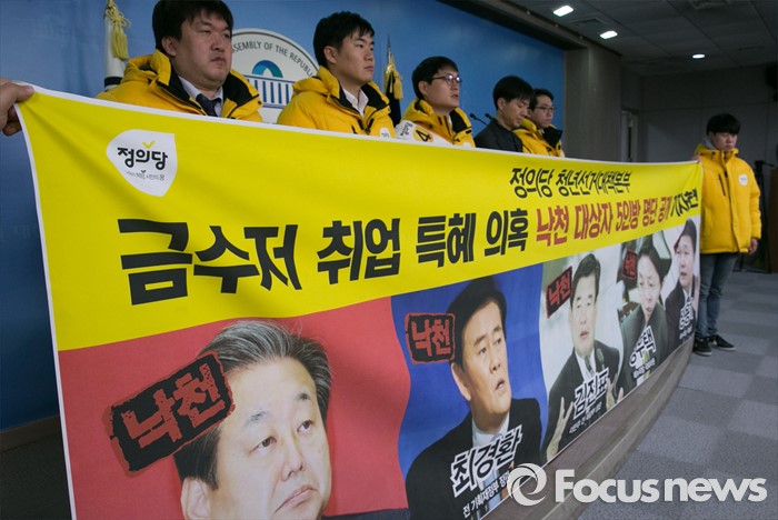 (서울=포커스뉴스) 11일 오전 서울 여의도 국회 정론관에서 정의당 청년선대본부가 금수저 취업 특혜 의혹 5인방 공천 낙마 촉구 기자회견을 하고 있다. 이날 명단에 발표된 5인방은 김무성 새누리당 대표, 최경환, 정우택, 정용기 의원, 김진표 전 더불어민주당 의원이다.