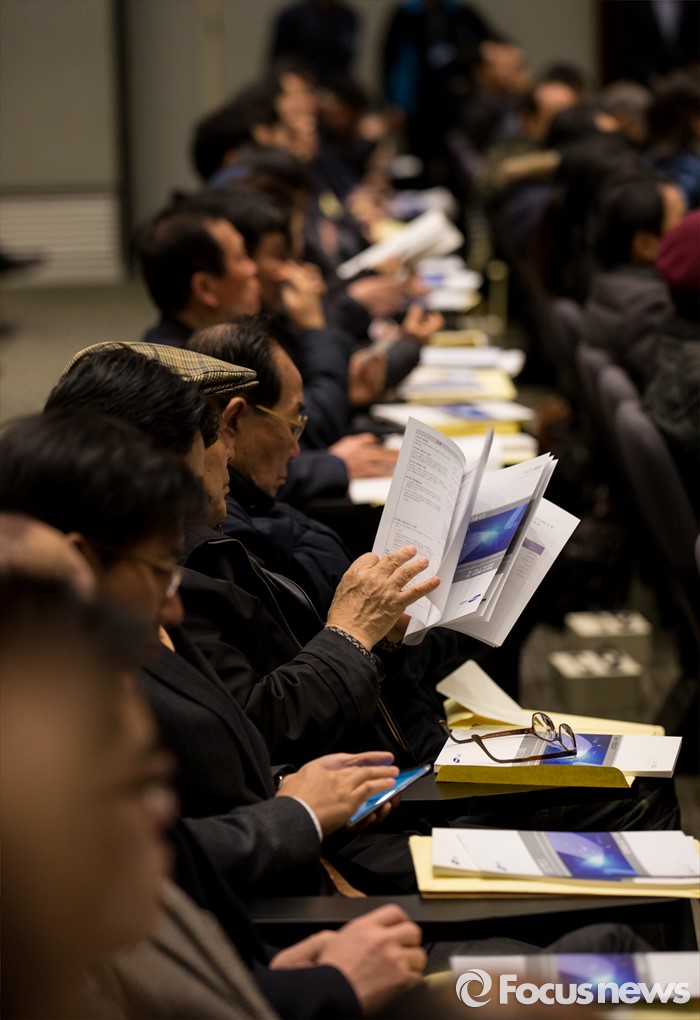 (서울=포커스뉴스) 11일 오전 서울 서초구 삼성전자 본사 다목적홀에서 열린 47기 정기주주총회에 참석한 주주들이 안내책자를 살펴보고 있다.