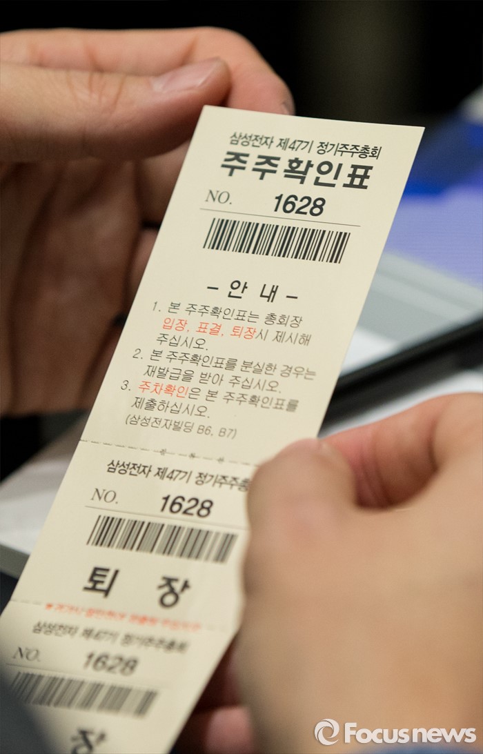 (서울=포커스뉴스) 11일 오전 서울 서초구 삼성전자 본사 다목적홀에서 열린 47기 정기주주총회에 참석한 한 주주가 주주확인표와 표결용지를 확인하고 있다.