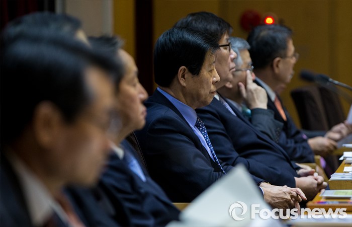 (서울=포커스뉴스) 11일 오전 서울 강남구 포스코센터에서 열린 정기주주총회에 참석한 이사진이 권오준 포스코 회장의 인사말을 듣고 있다.