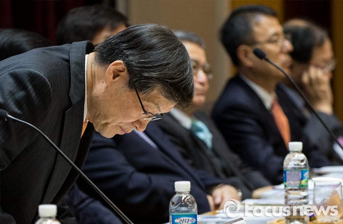 (서울=포커스뉴스) 11일 오전 서울 강남구 포스코센터에서 열린 정기주주총회에 참석한 권오준 포스코 회장이 인사말을 마친 후 착석하고 있다.