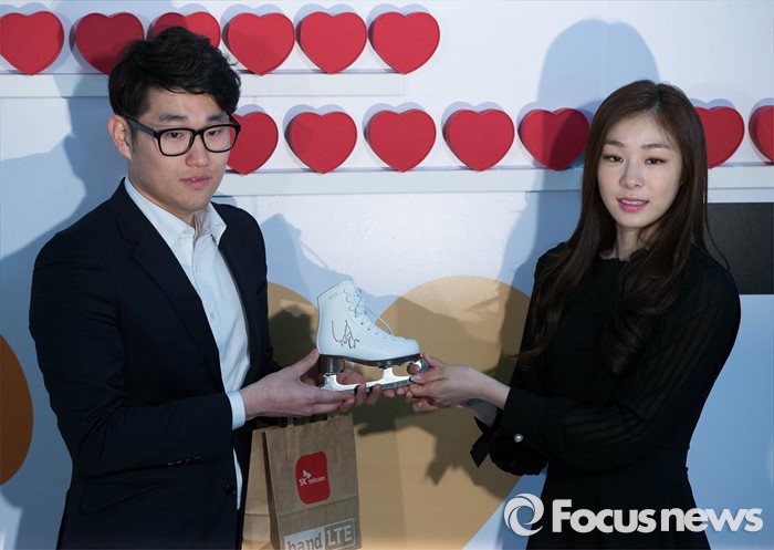 (서울=포커스뉴스) 11일 오전 서울 종로구 종각 T월드 카페에서 삼성 갤럭시 S7 론칭행사에 참석한 전 피겨국가대표 김연아(오른쪽)가 1호 개통자 이건희씨에게 친필 사인 스케이트를 선물하고 있다.