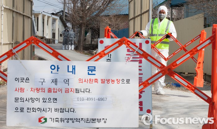 (논산=포커스뉴스) 지난 10일 충남 논산 광석면 소재 돼지농가에서 구제역 의심신고가 접수된 돼지가 11일 확진판정을 받은 가운데 농장이 위치한 마을 입구에서 방역 관계자들이 방역작업을 하고 있다. 해당 농가에서 사육중인 돼지 400마리는 모두 매몰 처분 됐으며, 이번 구제역 추가로 확인됨에 따라 충남지역에서만 5건의 구제역이 발생했다.