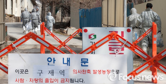 (논산=포커스뉴스) 지난 10일 충남 논산 광석면 소재 돼지농가에서 구제역 의심신고가 접수된 돼지가 11일 확진판정을 받은 가운데 농장이 위치한 마을 입구에서 방역 관계자들이 방역작업을 하고 있다. 해당 농가에서 사육중인 돼지 400마리는 모두 매몰 처분 됐으며, 이번 구제역 추가로 확인됨에 따라 충남지역에서만 5건의 구제역이 발생했다.