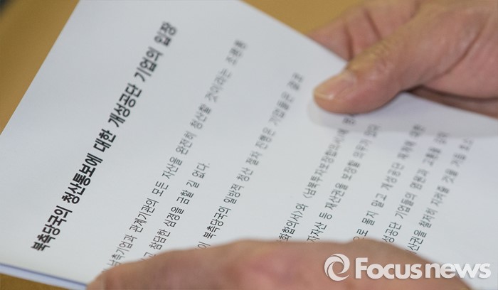 (서울=포커스뉴스) 11일 오전 서울 영등포구 중소기업중앙회 중회의실에서 정기섭 회장을 비롯한 임원들이 북한당국의 개성공단 자산 청산통보에 대한 입주기업의 입장을 발표하고 있다.
