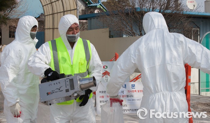(논산=포커스뉴스) 지난 10일 충남 논산 광석면 소재 돼지농가에서 구제역 의심신고가 접수된 돼지가 11일 확진판정을 받은 가운데 농장이 위치한 마을 입구에서 방역 관계자들이 소독을 하고 있다. 해당 농가에서 사육중인 돼지 400마리는 모두 매몰 처분 됐으며, 이번 구제역 추가로 확인됨에 따라 충남지역에서만 5건의 구제역이 발생했다.