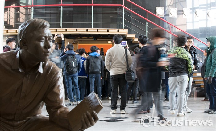 (대전=포커스뉴스) 이세돌 9단과 겨루는 인공지능 컴퓨터 알파고를 개발한 구글 딥마인드 최고경영자 데미스 하사비스가 11일 오후 대전 유성구 한국과학기술원(KIST)에서 '인공지능과 미래' 라는 주제로 강연이 열렸다. 강당에 들어가지 못한 학생들이 입구에서 강연을 기다리고 있다.