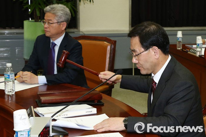(서울=포커스뉴스) 주호영(오른쪽) 정보위원장이 11일 오후 서울 여의도 국회에서 사이버테러방지법 논의를 위한 국회 정보위원회 전체회의에 참석해 의사봉을 두드리고 있다.