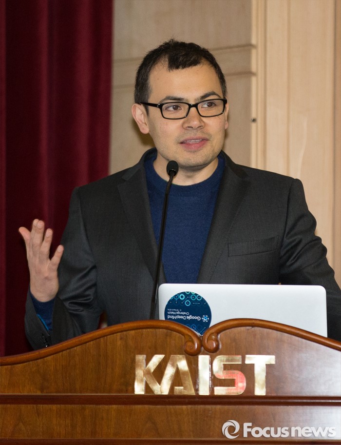 (대전=포커스뉴스) 이세돌 9단과 겨루는 인공지능 컴퓨터 알파고를 개발한 구글 딥마인드 최고경영자 데미스 하사비스가 11일 오후 대전 유성구 한국과학기술원(KIST)에서 '인공지능과 미래' 라는 주제로 강연을 하고 있다.