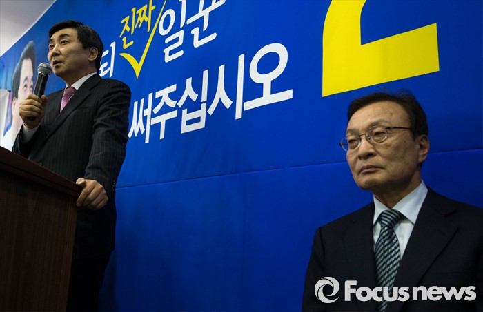 (공주=포커스뉴스) 이해찬(오른쪽) 전 국무총리가 11일 오후 충남 공주시에서 열린 더민주 박수현 의원의 선거사무소 개소식에 참석, 박 의원의 지지를 호소하는 이종걸 원내대표의 발언을 듣고 있다.