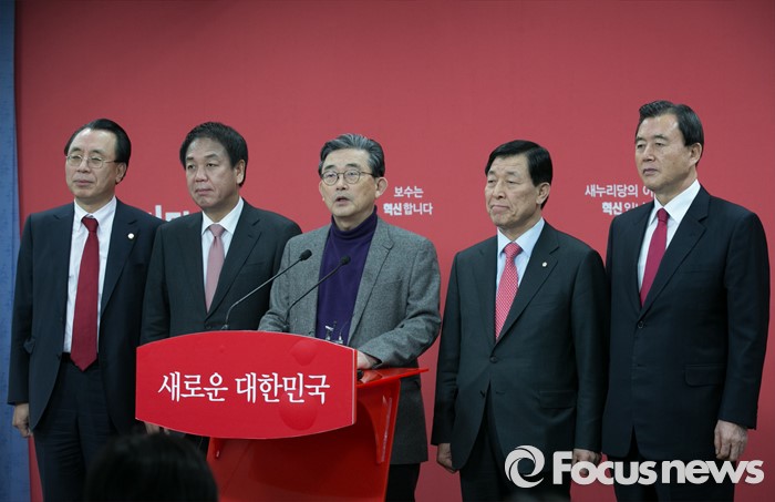 (서울=포커스뉴스) 이한구 새누리당 공천관리위원장과 위원들이 11일 오후 서울 여의도 당사에서 공관위 내부 갈등 등에 대해 사과하는 내용의 기자회견을 하고 있다. 왼쪽부터 김회선, 박종희 위원, 이 위원장, 황진하 부위원장, 홍문표 위원.