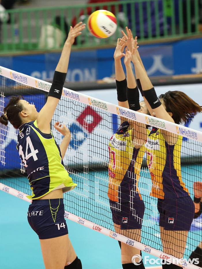 양팀은 오는 13일 오후 2시 인천계양체육관으로 자리를 옮겨 2차전을 치른다. 패배한 흥국생명으로서는 역대 플레이오프 1차전에서 패한 팀이 챔피언결정전에 오른 바 없는 만큼 0%의 확률에 도전해야 하는 상황이다.(수원=포커스뉴스) 2015년 1월5일 수원실내체육관에서 열린 프로배구 '2015~2016 NH농협 V-리그’여자부 2라운드 현대건설-흥국생명 경기에서 현대건설 양효진의의 연타 공격에 흥국생명 이재영, 김수지가 블로킹으로 막고 있다. 2015.11.05 우정식 기자