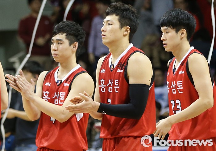 (안양=포커스뉴스) 11일 안양실내체육관에서 열린 2015-2016 프로농구 KGC-KCC 4강플레이오프 3차전에서 2패뒤 1승을 올려 4차전까지 끌고간 KGC 김윤태, 이정현, 전성현이 박수를 치고 있다.