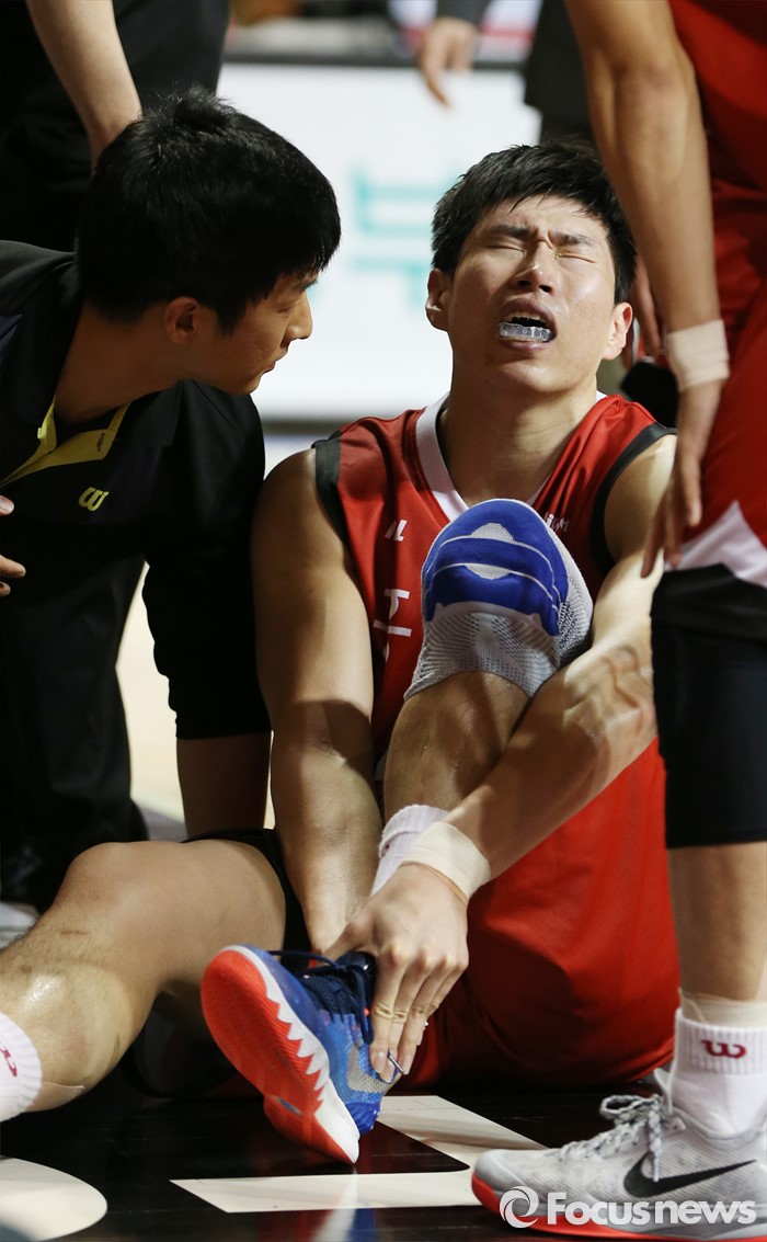 (안양=포커스뉴스) 11일 안양실내체육관에서 열린 2015-2016 프로농구 KGC-KCC 4강플레이오프 3차전에서 KGC 오세근이 경기중 왼쪽 발목을 다쳐 고통스러워하고 있다.