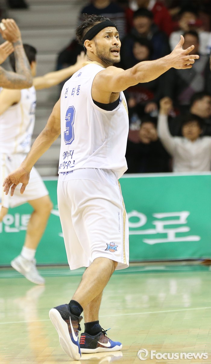 (안양=포커스뉴스) 11일 안양실내체육관에서 열린 2015-2016 프로농구 KGC-KCC 4강플레이오프 3차전에서 KCC 전태풍이 주심에게 자신의 득점이 3점슛이라고 항의하고 있다.