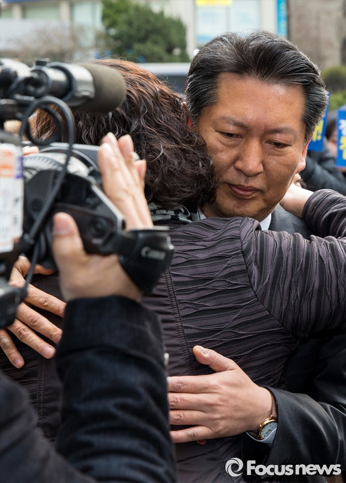 (서울=포커스뉴스) 20대 총선 공천 배제된 정청래 더불어민주당 의원이 12일 오전 공직선거후보자추천재심위원회에 재심신청서를 제출하기 위해 서울 여의도 더민주 당사를 향하며 지지자들과 포옹하고 있다.