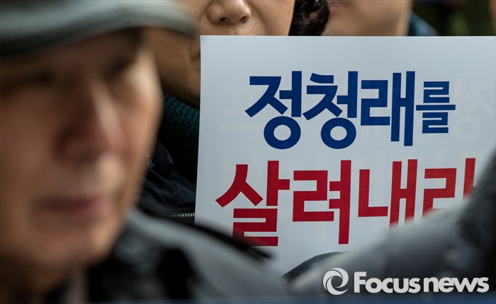 (서울=포커스뉴스) 12일 오전 서울 여의도 더민주 당사 앞에서 정청래 더불어민주당 의원 지지자들이 정 의원의 컷오프 철회를 요구하는 손팻말을 들고 있다. 이날 정 의원은 공직선거후보자 추천 재심위 재심신청서 접수를 마쳤다.