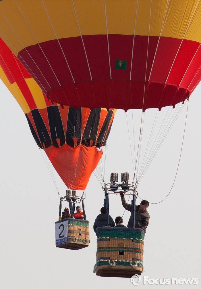 (논산=포커스뉴스) 12일 오전 충남 논산 강경읍 수변공원 일대에서 열린 2015-2016시즌 코리아열기구그랑프리 5차전 ‘오프로드컵’에서 대회에 출전한 선수들이 공중 레이스를 펼치고 있다.