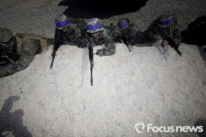 (포항=포커스뉴스) 12일 오후 경북 포항시 일대 해안에서 한미해병대의 연합상륙작전이 실시되었다. 해안가로 돌진하고 있는 상륙돌격장차들에서 일제히 연막을 전개하고 있다.