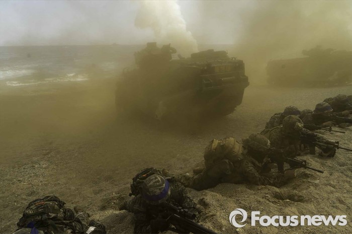 (포항=포커스뉴스) 12일 오후 경북 포항시 일대 해안에서 한미해병대의 연합상륙작전이 실시되었다. 해안가로 돌진하고 있는 상륙돌격장차들에서 일제히 연막을 전개하고 있다.
