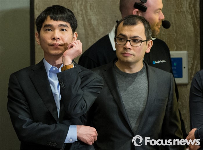 (서울=포커스뉴스) 12일 오후 서울 종로구 포시즌스호텔에서 열린 구글 딥마인드 챌린지 매치 제3국 기자회견에 참석한 이세돌) 9단(왼쪽), 데미스 하사비스 구글 딥마인드 대표가 입장을 기다리고 있다.