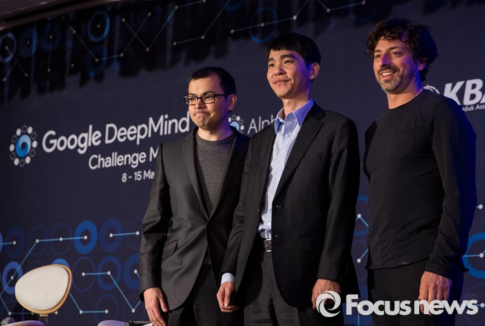 (서울=포커스뉴스) 12일 오후 서울 종로구 포시즌스호텔에서 열린 구글 딥마인드 챌린지 매치 제3국 기자회견에 참석한 데미스 하사비스(왼쪽부터) 구글 딥마인드 대표, 이세돌 9단, 세르게이 브린 구글 공동 창업자가 포즈를 취하고 있다.