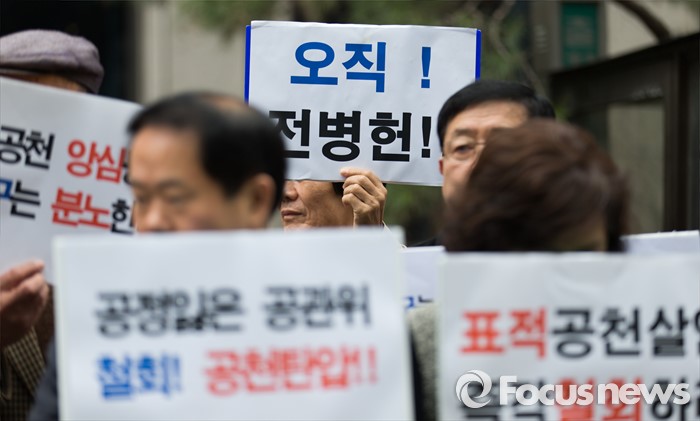 (서울=포커스뉴스) 13일 오전 서울 여의도 더민주 당사 앞에서 전병헌 더불어민주당 의원 지지자들이 정 의원의 컷오프 철회를 요구하는 손팻말을 들고 있다.