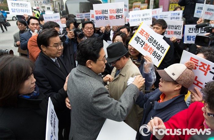 (서울=포커스뉴스) 20대 총선 공천 배제된 전병헌 더불어민주당 의원이 13일 오전 공직선거후보자추천재심위원회에 재심신청서를 제출하기 위해 서울 여의도 당사 방문 전 지지자들과 포옹하고 있다.