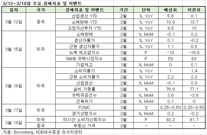 오는 16일에는 미국의 2월 소비자물가가 발표된다. 시장에서는 "2월 소비자물가가 전년 대비 2.2% 증가로 전달과 동일한 수준을 나타낼 것"으로 보고 있다.