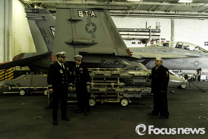(부산=포커스뉴스) 13일 오후 부산 남구에 위치한 해군작전사령부에 입항한 존 C. 스테니스 핵항모가 취재진에게 공개되었다. 키리졸브 독수리 훈련에 참가하기 위해 한국을 찾은 스테니스항모는 길이 333m, 폭 78m,탑승 승조원은 6500명에 달하는 미 해군 핵심항모 중 하나다. 비행격납고에 주기 중인 F/A-18 슈퍼호넷 전투기.