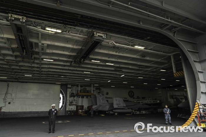 (부산=포커스뉴스) 13일 오후 부산 남구에 위치한 해군작전사령부에 입항한 존 C. 스테니스 핵항모가 취재진에게 공개되었다. 키리졸브 독수리 훈련에 참가하기 위해 한국을 찾은 스테니스항모는 길이 333m, 폭 78m,탑승 승조원은 6500명에 달하는 미 해군 핵심항모 중 하나다. 비행갑판 하단에 위치한 격납고.