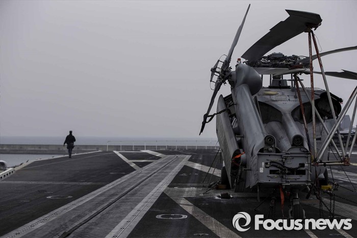(부산=포커스뉴스) 13일 오후 부산 남구에 위치한 해군작전사령부에 입항한 존 C. 스테니스 핵항모가 취재진에게 공개되었다. 키리졸브 독수리 훈련에 참가하기 위해 한국을 찾은 스테니스항모는 길이 333m, 폭 78m,탑승 승조원은 6500명에 달하는 미 해군 핵심항모 중 하나다. SH-60 씨호크 헬기가 비행갑판 위에 주기되어 있다.