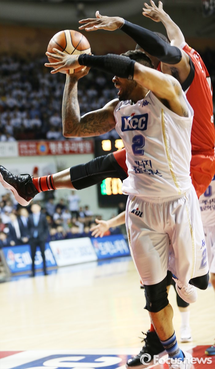 (안양=포커스뉴스) 13일 안양실내체육관에서 열린 2015-2016 프로농구 KGC-KCC 4강플레이오프 4차전에서 KCC 전태풍의 슈팅을 막으려던 KGC 찰스 로드가 균형을 잃고 떨어지고 있다.