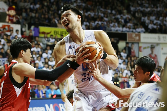 (안양=포커스뉴스) 13일 안양실내체육관에서 열린 2015-2016 프로농구 KGC-KCC 4강플레이오프 4차전에서 KCC 하승진을 KGC 김민욱과 양희종이 양쪽에서 마크하고 있다.