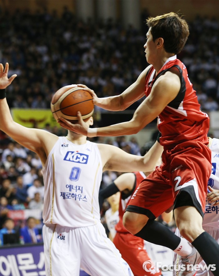 (안양=포커스뉴스) 13일 안양실내체육관에서 열린 2015-2016 프로농구 KGC-KCC 4강플레이오프 4차전에서 KGC 김기윤이 골밑으로 치고 들어가 수비를 끌어 모은뒤 와곽으로 패스하고 있다.