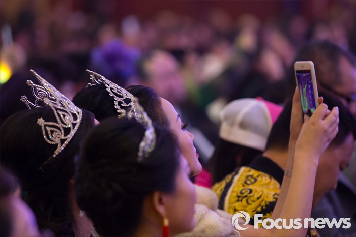 (동관/중국=포커스뉴스) 12일 오후 중국 광동성 동관에서 열린 제27회 미시즈월드 미인대회에서 왕관을 쓴 관람객들이 사진을 찍고 있다.