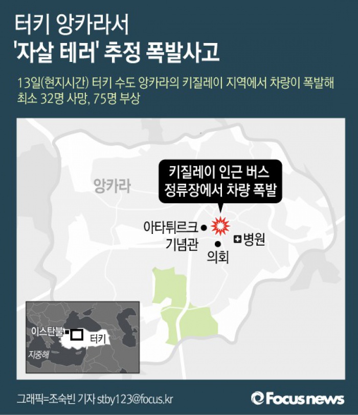 (서울=포커스뉴스) 13일(현지시간) 터키 수도 앙카라의 키질레이 지역에서 차량이 폭발해 최소 32명 사망, 75명 부상당했다.