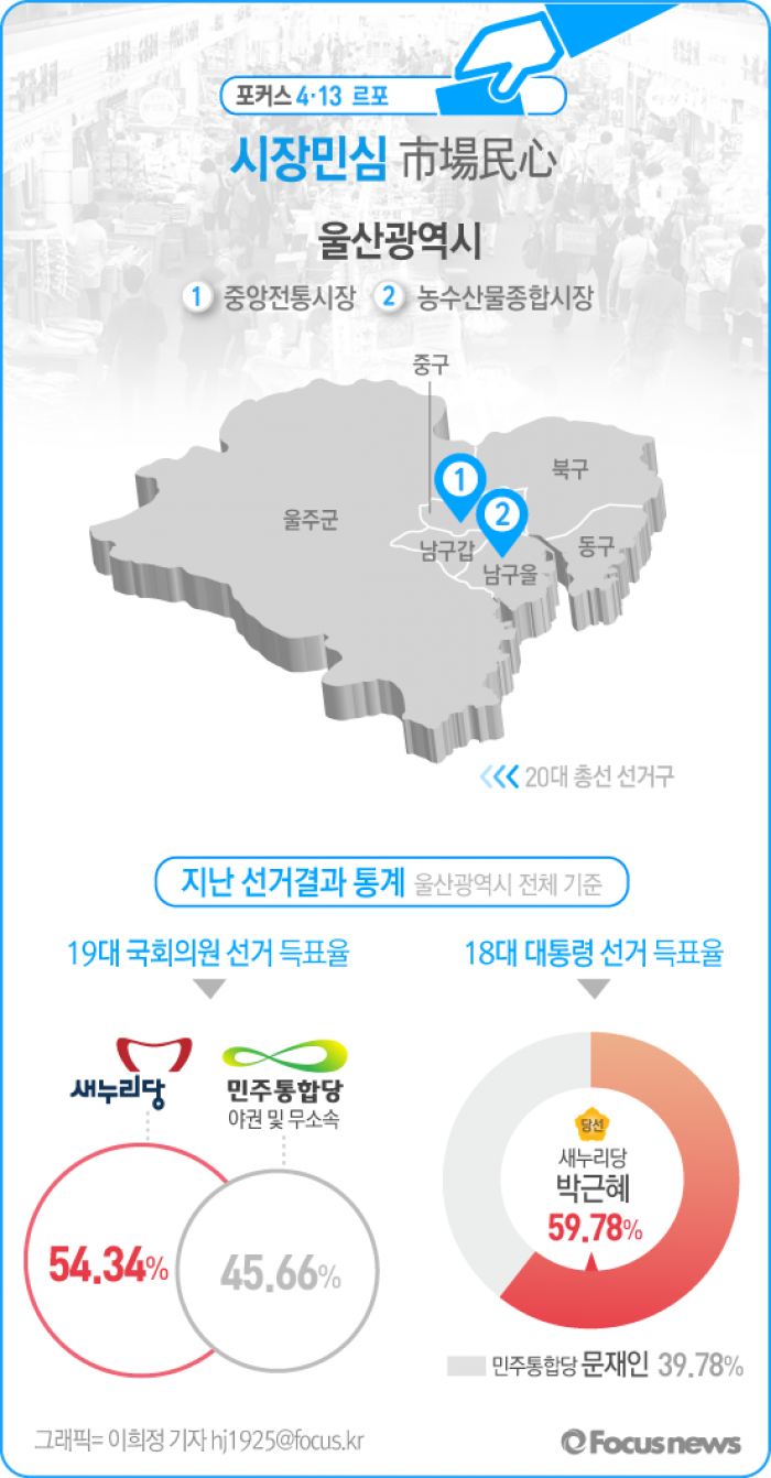 (서울=포커스뉴스) 20대 국회의원 선거를 앞두고 울산 민심을 듣기 위해 최대시장인 중앙전통시장과 농수산물종합시장을 찾았다. 재래시장에서 들어본 울산 서민의 민심은 확고한 '여당 지지' 그 자체였다. 야권을 지지하는 목소리도 있었지만, 소수에 그쳤다.