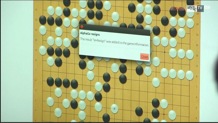 화면 위 팝업 창으로 패배 선언 "AlphaGo resigns"