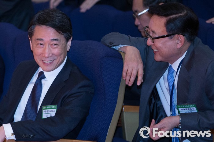 (서울=포커스뉴스) 14일 오전 서울 종로구 외교부 청사에서 열린 '2016년도 재외공관장회의'에 참석한 오준(왼쪽) 대사가 김광동 주홍콩총영사와 대화를 나누고 있다.
