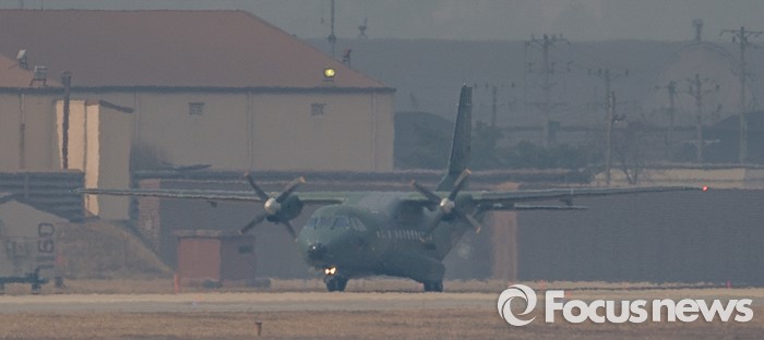 (평택=포커스뉴스) 한·미연합훈련(키리졸브연습·독수리훈련·쌍용훈련) 2주차를 맞아 북한 진격 위주의 2부 훈련에 돌입한 14일 오전 경기도 평택시 주한미군 오산공군기지에 한국 공군 소속의 CN-235 수송기가 착륙해 이동하고 있다.