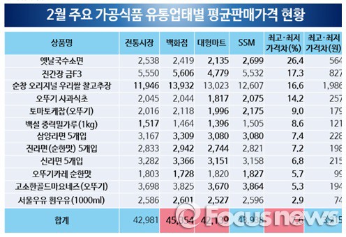 주요 가공식품의 평균 장바구니 가격을 유통업태별로 보면, 대형마트가 4만2139원으로 가장 저렴했다. 이어 전통시장 4만2981원, 기업형 슈퍼마켓(SSM) 4만3938원, 백화점 4만5354원 순이다. 특히 옛날국수소면의 경우 유통업태별 최고·최저 가격차가 564원, 26.4%로 가장 컸다.