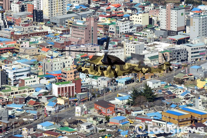 (대구=포커스뉴스) 10일 오후 제2작전사령부 예하부대에서 육군항공·특공부대 전개훈련에 참가한 국산 헬기 수리온(KUH-1)이 201특공여단 장병들을 태우고 경북 대구와 영천 상공 일대를 전술비행하고 있다.