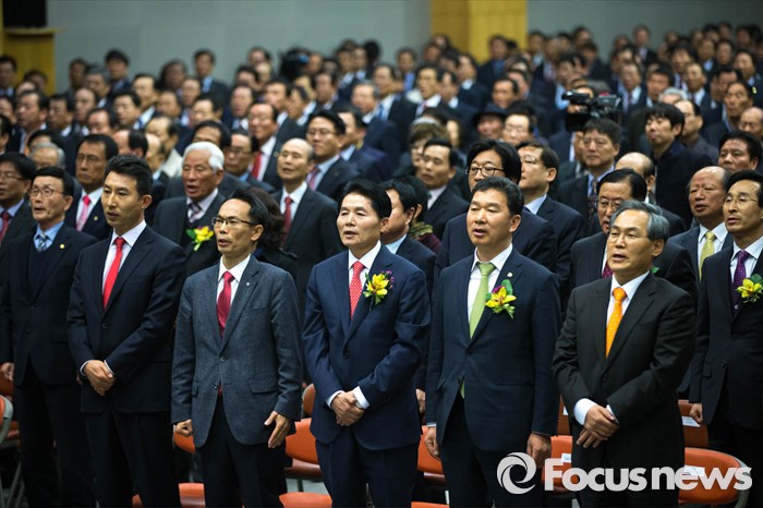 (서울=포커스뉴스) 김병원(오른쪽 세번째) 농협 신임 회장이 14일 오전 서울 중구 농협 중앙회에서 열린 신임 회장 취임식에 참석해있다.
