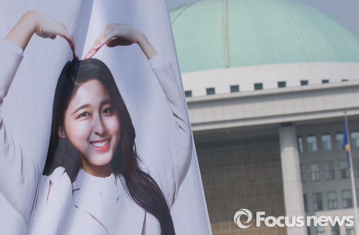 (서울=포커스뉴스) 20대 총선을 30일 앞둔 14일 오전 서울 여의도 국회 앞에서 서울시선거관리위원회 직원들이 '아름다운 선거 홍보대사'인 그룹 AOA의 설현을 모델로 제작된 가로등 현수기를 게시하고 있다.