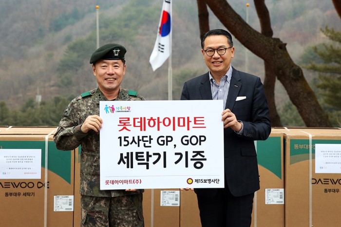 롯데하이마트는 14일 이동우 대표이사와 안준석 15사단장이 참석한 가운데 강원도 화천군 육군 15사단 사령부에서 세탁기 전달식을 가졌다. 이날 행사는 최근 군사적 긴장감이 고조된 상황에 국가안보를 위해 헌신하고 있는 국군장병들을 격려하는 뜻에서 마련됐다.