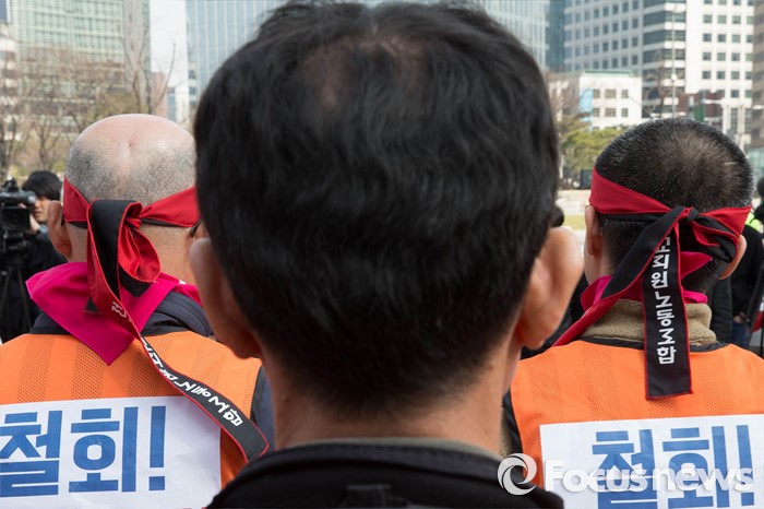 (서울=포커스뉴스) 14일 오후 서울 종로구 정부서울청사앞에서 전국교직원노동조합원 및 관계자들이 법외노조 판결에 대한 교육당국의 후속조치 철회를 촉구하고 있다.