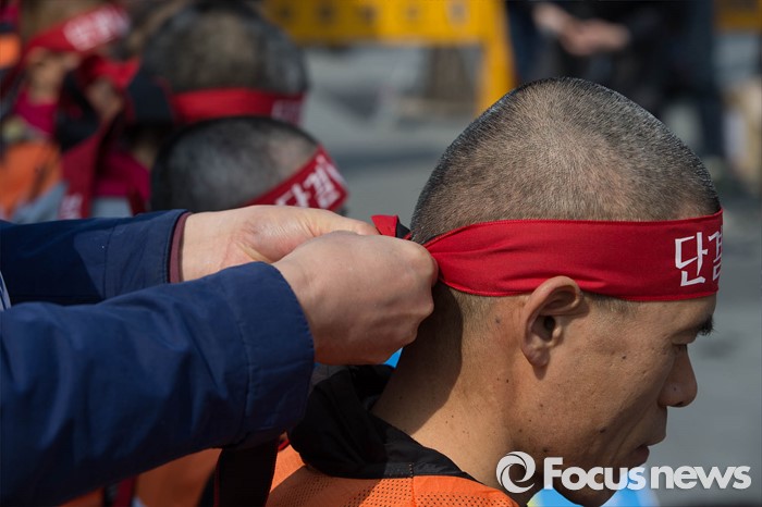 (서울=포커스뉴스) 14일 오후 서울 종로구 정부서울청사앞에서 전국교직원노동조합원 및 관계자들이 법외노조 판결에 대한 교육당국의 후속조치 철회를 촉구하며 삭발한 뒤 머리끈을 하고 있다.