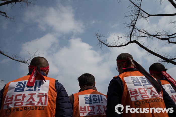 (서울=포커스뉴스) 14일 오후 서울 종로구 정부서울청사앞에서 전국교직원노동조합원 및 관계자들이 법외노조 판결에 대한 교육당국의 후속조치 철회를 촉구하고 있다.