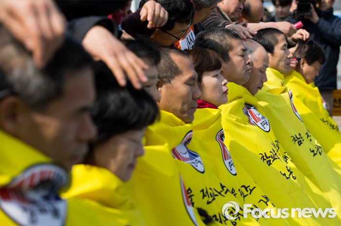 (서울=포커스뉴스) 14일 오후 서울 종로구 정부서울청사 앞에서 전국교직원노동조합 전임자들이 정부의 법외노조 후속조치와 부당탄압에 항의하며 삭발식을 하고 있다.